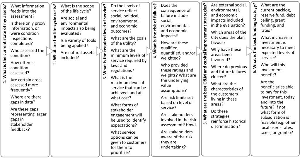 Whether or not the trade-off between infrastructure investment and health and safety is made explicit, it exists. The assumptions, biases, and potential pitfalls of current asset management practices is not always clear. According to the Water Environment Research Foundation, asset management practices should answer the following six big questions: